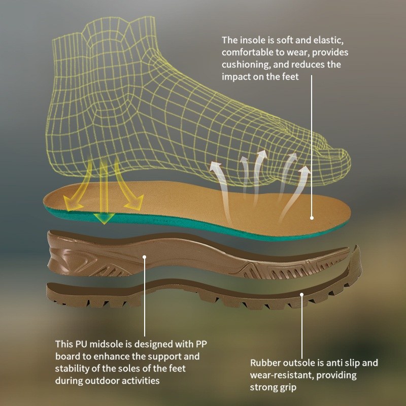 ①Pohjallinen on pehmeä ja joustava, mukava käyttää, tarjoaa pehmusteen ja vähentää iskua jalkoihin; ②Tämä PU-välipohja on suunniteltu PP-levyllä parantamaan jalkapohjien tukea ja vakautta ulkoilun aikana; ③ Kumipohja on luistamaton ja kulutusta kestävä, mikä tarjoaa vahvan pidon.