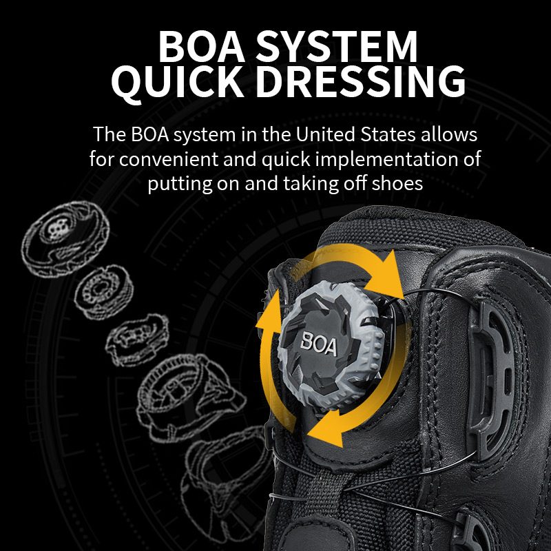BOA-järjestelmä tekee päälle/pois vaivattomaksi: kiristää nopeasti kiertämällä, vapauttamalla vetämällä. Ei nauhoja, ei vaivaa.