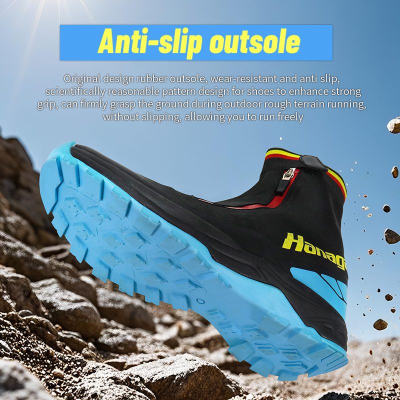 Alkuperäinen kumipohja, kulutusta kestävä ja luistamaton, tieteellisesti kohtuullinen kenkien kuviointi, joka parantaa vahvaa pitoa, voi lujasti tarttua maahan ulkona juoksevan epätasaisen maaston aikana, ilman liukastumista, jolloin voit juosta vapaasti.