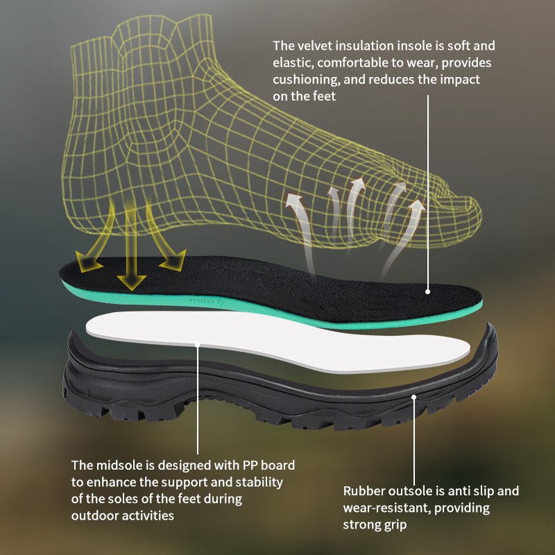①Samettivuori. Pehmeä jalkojen alla. Vaimentaa vaikutusta. ②PP-välipohja antaa vakaan tuen. ③ Kumipohja, joka ei päästä irti. Tarttuu, kestää, pysyy luotettavana.