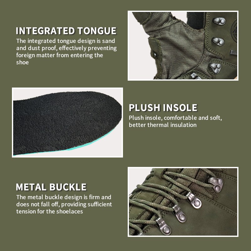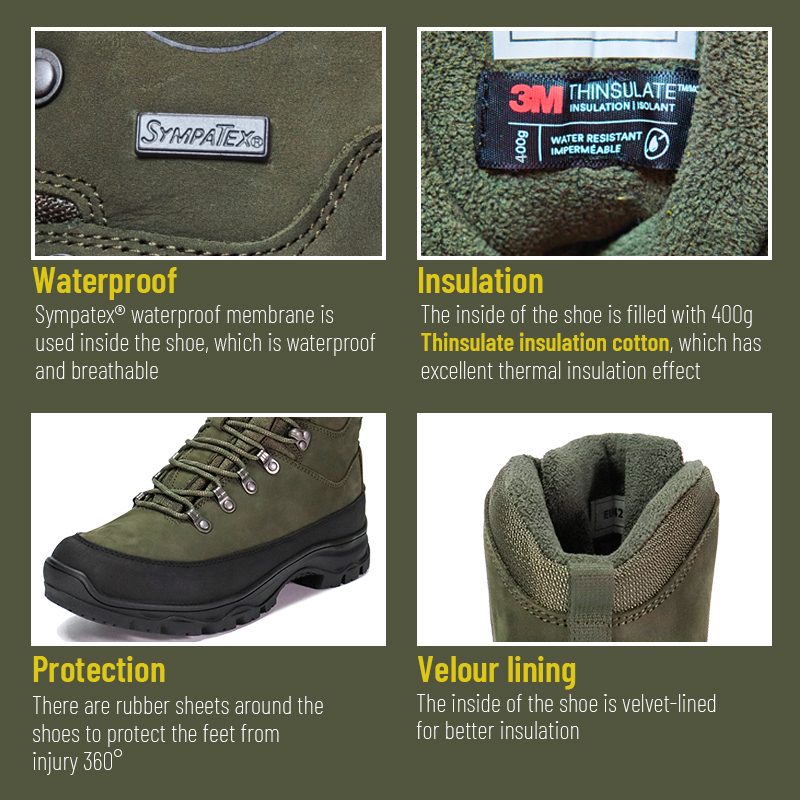 Nämä Sympatex Waterproof Insulation Thinsulate -metsästyssaappaat ovat saatavilla räätälöitävissä väreissä, materiaaleissa ja yksityiskohdissa, ja niiden MOQ on 800 paria, jotka ovat ihanteellisia brändiyhteistyöhön ja ryhmähankintoihin. Ja näillä metsästyssaappailla on seuraavat edut: